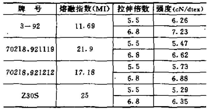 在試紡過程中發現,在完全相同盼工藝條件下,原料的熔融指數不同,其成品絲的強度不同,并呈單定的規律性(見表 2)。